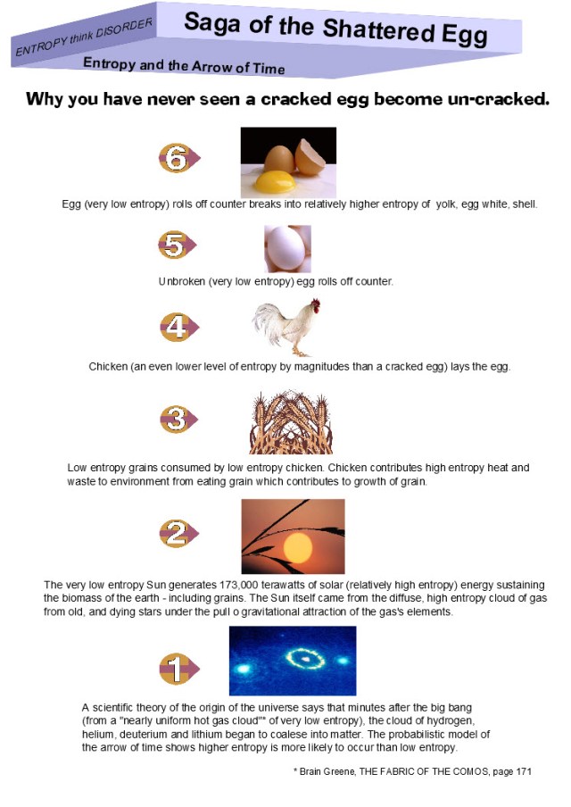 In chapter six of The Fabric of the Cosmos3 titled “Chance and the Arrow “, Brian Greene provides an amazing explanation of the arrow of time involving eggs and ice cubes.